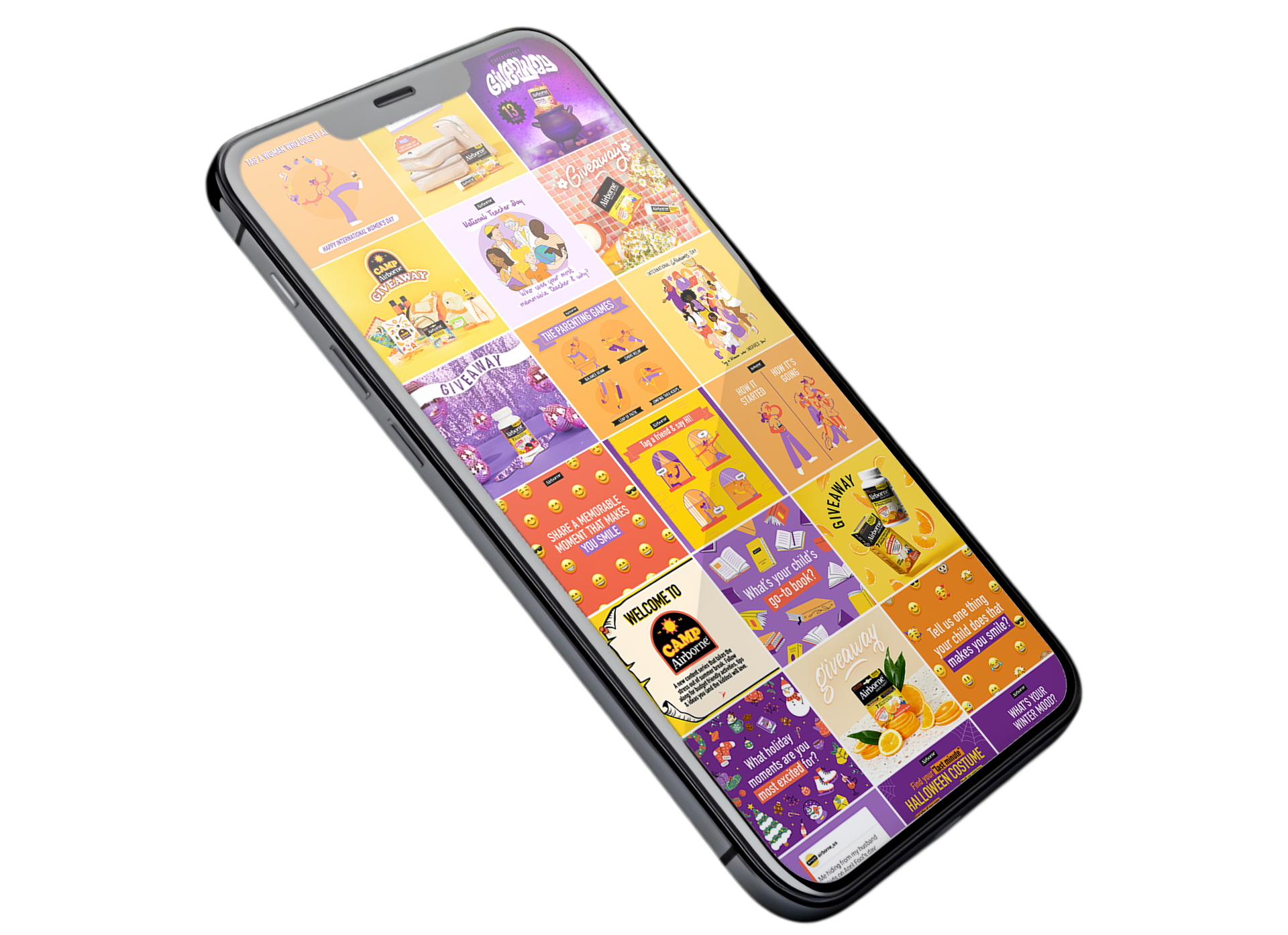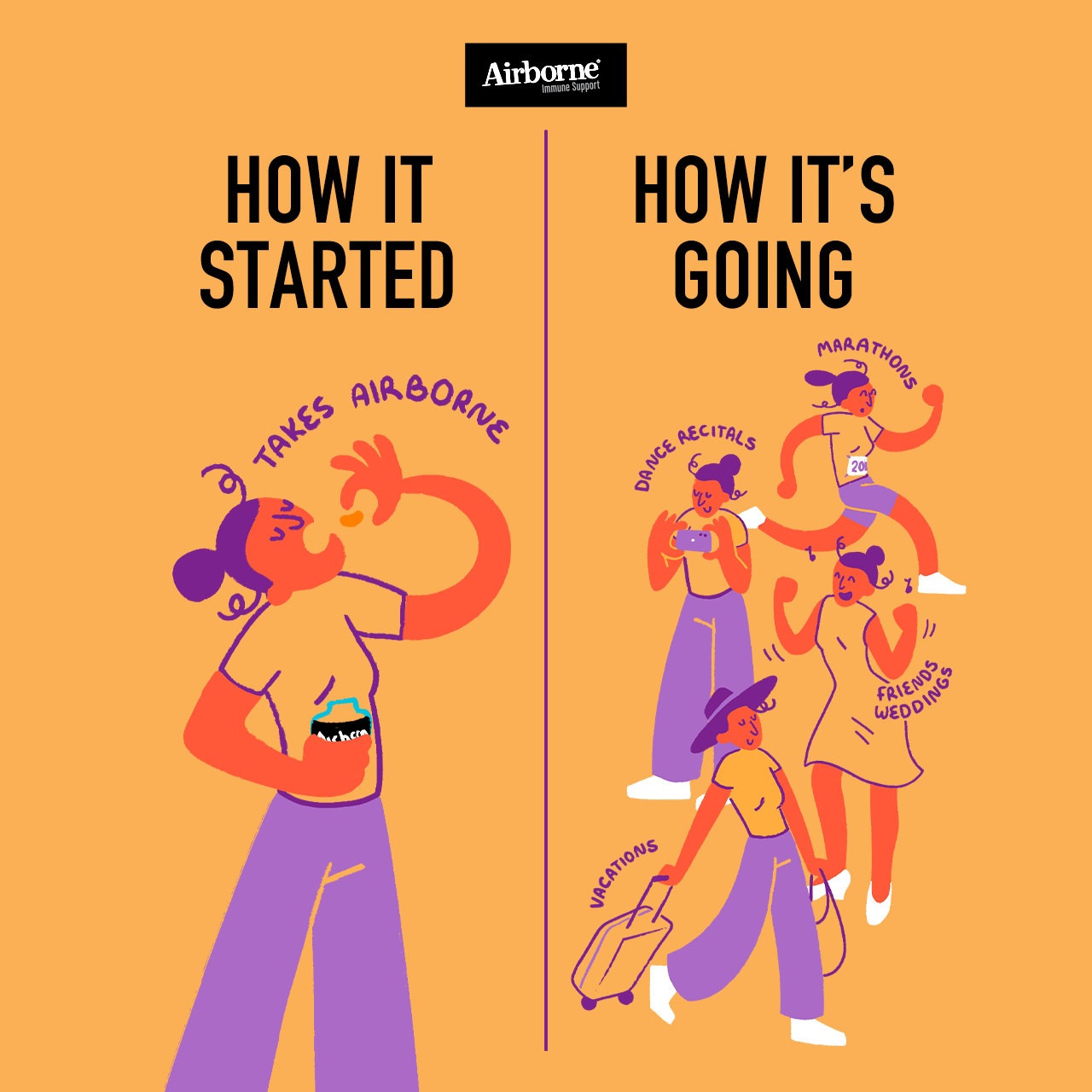 I create the vast majority of the static content for Airborne Immune Support; this involves digital illustration, hand lettering, some video and animation, and photo retouching.