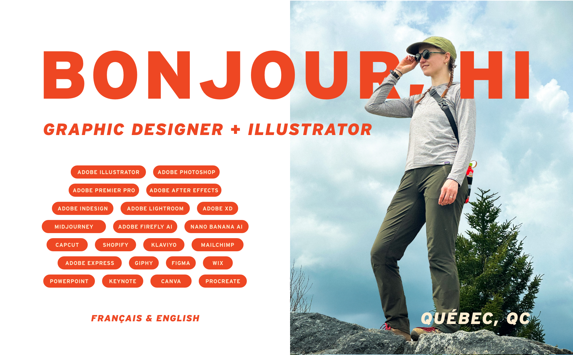 I’m a graphic designer and illustrator based in Quebec City, with over 7 years of experience working across digital and social media advertising, branding, packaging, web design, and more. I have a strong eye for typography and colour, and I love finding ways to bring illustration and hand lettering into my work whenever I can.